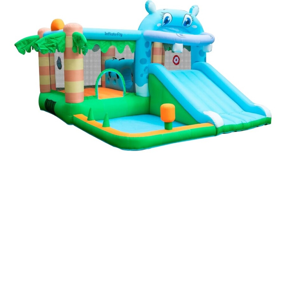 Castillo inflable azul con tobogán y zona de salto. Capacidad para 3 niños (135 kg). Fácil de armar y resistente, ideal para cumpleaños y juegos al aire libre.