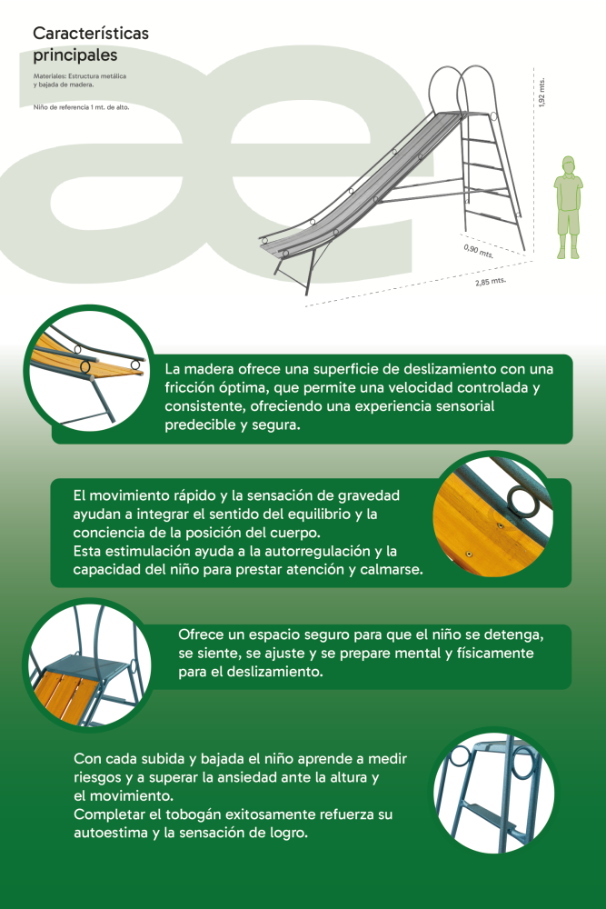 Este tobogán infantil de madera está diseñado para ofrecer diversión segura al aire libre. Su estructura cuenta con cuatro escalones con planchuela antideslizante y una sólida base metálica de hierro angular. Las tres tablas que forman la bajada están fabricadas en madera seleccionada para uso exterior, unidas con remaches de aluminio de alta resistencia.