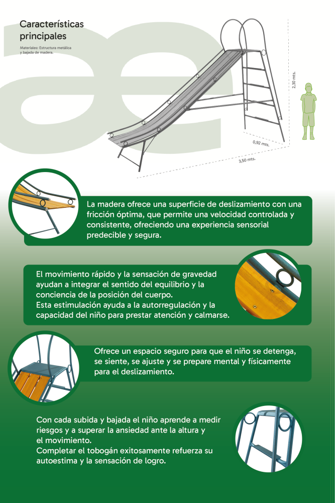 Con un largo total de 350 cm y ancho de 92 cm, es perfecto para parques infantiles, centros CAIF, colegios o jardines familiares. Fabricamos toda la línea de toboganes en diferentes alturas y ofrecemos modelos en metal, plástico o PVC. Somos fabricantes: consulte por variantes y medidas personalizadas.